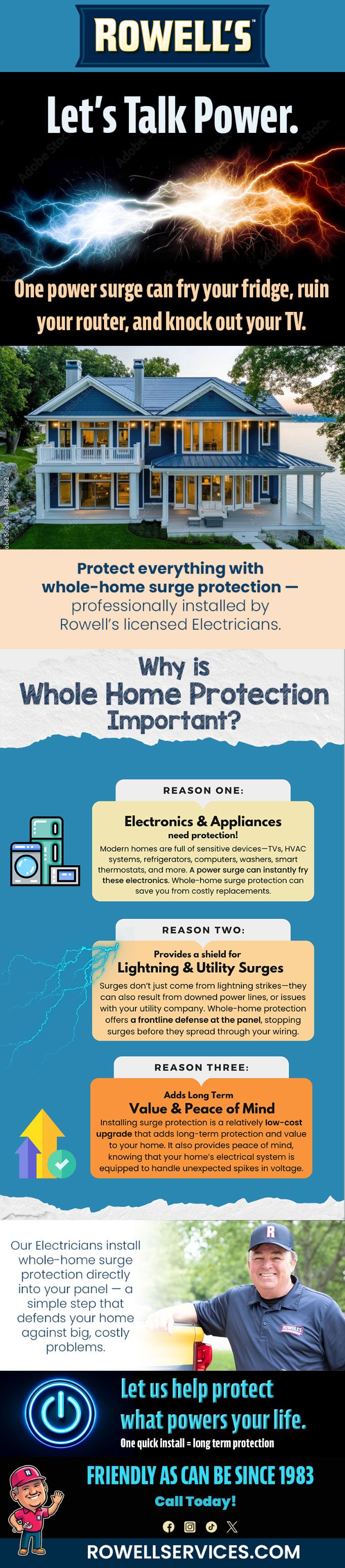 Protect everything with whole-home surge protection —professionally installed by Rowell's licensed Electricians.